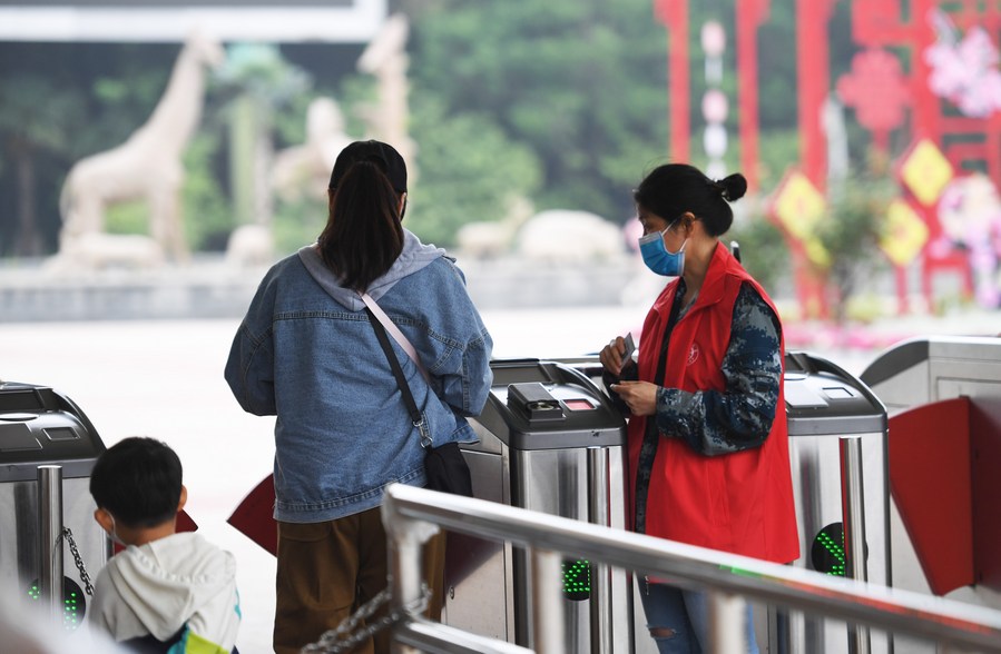 A citizen with a child gets tickets checked at the entrance of the Zhengzhou Zoo in Zhengzhou, central China's Henan Province, May 11, 2022. Zhengzhou has resumed work and production from May 11 in the city other than closed-off management areas and restrictive control areas. (Xinhua/Zhang Haoran)