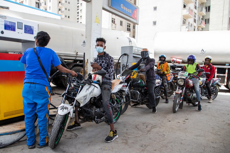 People wait to refuel motorcycles at a gas station in Addis Ababa, Ethiopia, May 10, 2022. The Ethiopia Ministry of Trade and Regional Integration (MoTRI) has announced a decision to hike gas prices by 16 percent starting Sunday. (Photo by Michael Tewelde/Xinhua)