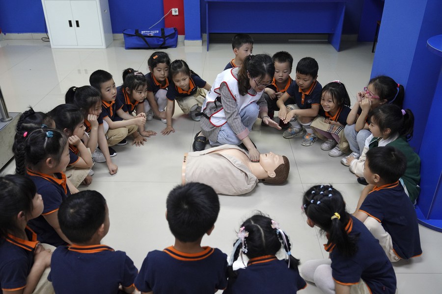 A medical staff member teaches children CPR at Xinjiayuan Community in Beibei District, southwest China's Chongqing, May 11, 2022. (Photo by Qin Tingfu/Xinhua)