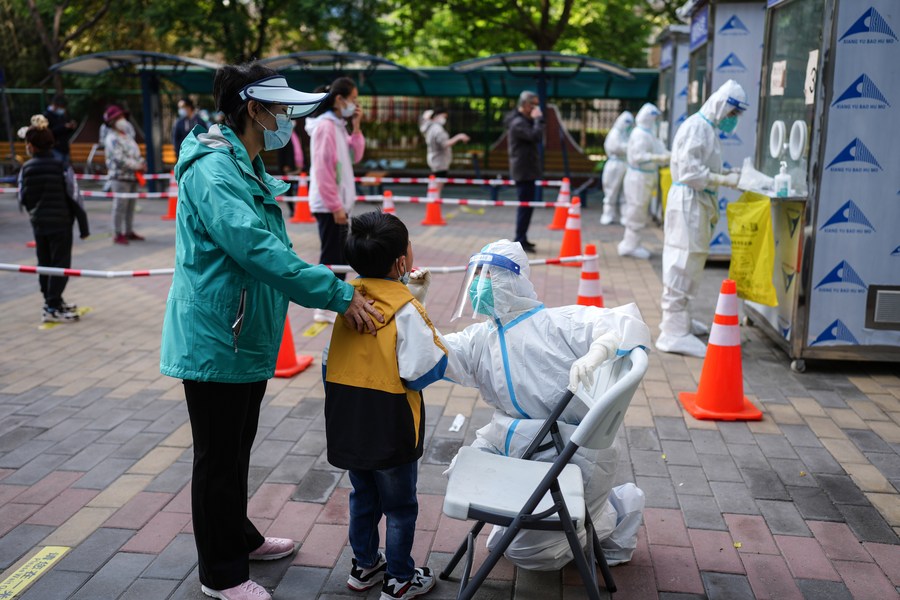 A medical staff member of the nucleic acid sampling team of Xuanwu Hospital takes nucleic acid sample for a child at a community in Baizhifang Street of Xicheng District in Beijing, capital of China, May 11, 2022.(Xinhua/Peng Ziyang)