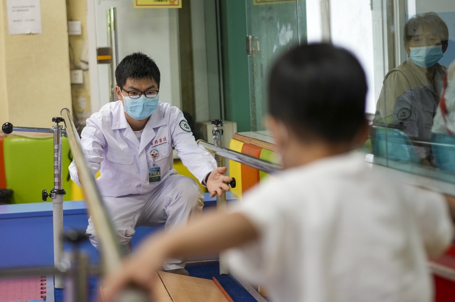 Yao Yao (L), a male nurse of the pediatric rehabilitation center in Xinqiao Hospital affiliated to the Army Medical University, coaches a child in exercise training at the center in southwest China's Chongqing, May 10, 2022. (Xinhua/Liu Chan)
