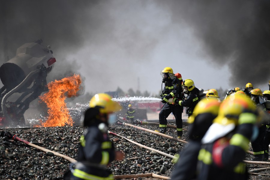 Participants take part in a fire extinguishing drill in Ganzhou District of Zhangye City, northwest China's Gansu Province, May 11, 2022. (Xinhua/Chen Bin)