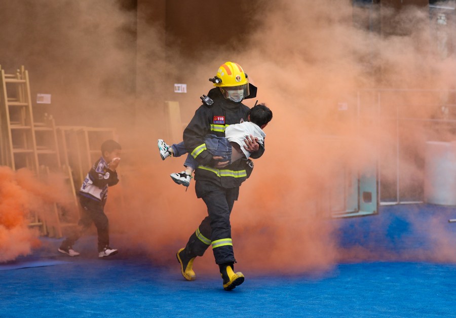 A firefighter guides children during a fire escape drill at Zaojiaoping kindergarten in Tongren, southwest China's Guizhou Province, May 11, 2022. (Photo by Hu Panxue/Xinhua)
