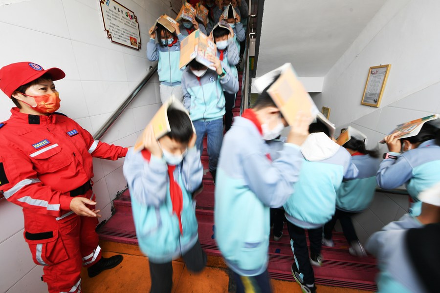 A volunteer guides pupils during an earthquake prevention and emergency drill at Qingyun primary school in Qiaocheng District of Bozhou City, east China's Anhui Province, May 11, 2022. (Photo by Zhang Yanlin/Xinhua)