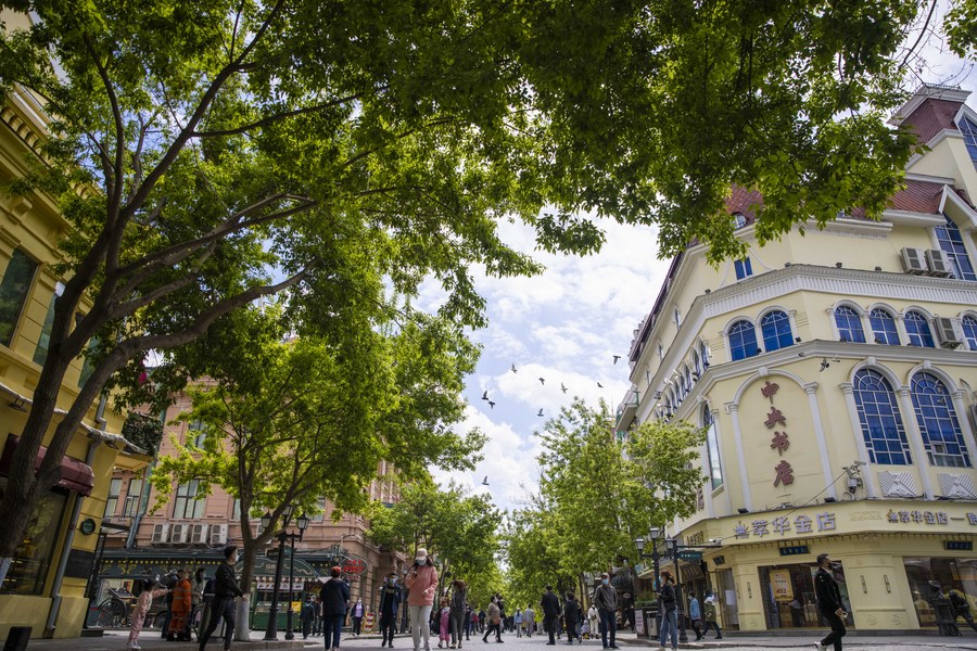 Citizens walk on the Central Street in Harbin, northeast China's Heilongjiang Province, May 11, 2022. Harbin started to resume normal life and production in an orderly manner from Wednesday. (Xinhua/Zhang Tao)