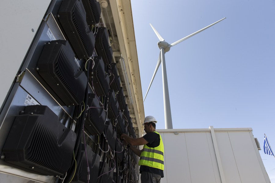 An employee works by the batteries of the energy storage system on the island of Tilos, Greece, May 9, 2022. Tilos, a small island at the southeastern Aegean with over 500 residents, is the first island in Greece to rely entirely on renewable energy to meet its energy needs. After being self-sufficient in energy through wind and solar power, the island, with about 80 percent of its waste now recycled, also aims to become a "zero waste" island. (Photo by Marios Lolos/Xinhua)