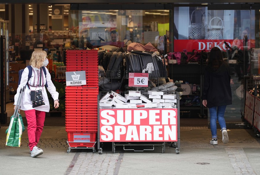 Customers are seen at a shop in Berlin, capital of Germany, on May 11, 2022. Germany's inflation rate in April rose to 7.4 percent amid soaring energy prices, according to confirmed figures published by the Federal Statistical Office (Destatis) on Wednesday. (Photo by Stefan Zeitz/Xinhua)