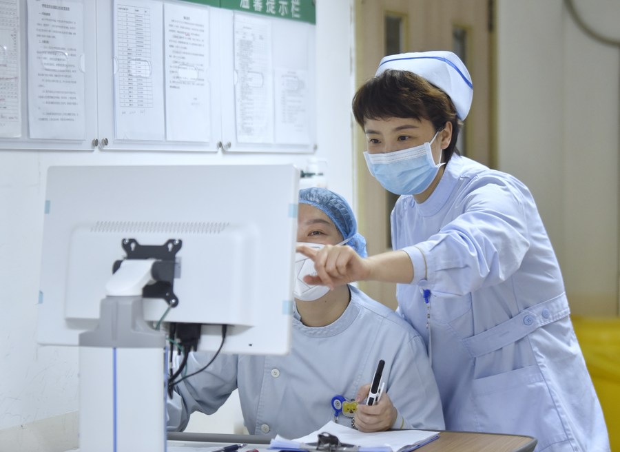 Feng Jing (R), head nurse of Public Health Clinical Center of Chengdu, checks records of critically ill patients with her colleague at the center in Chengdu, southwest China's Sichuan Province, May 9, 2022. (Xinhua/Liu Kun)