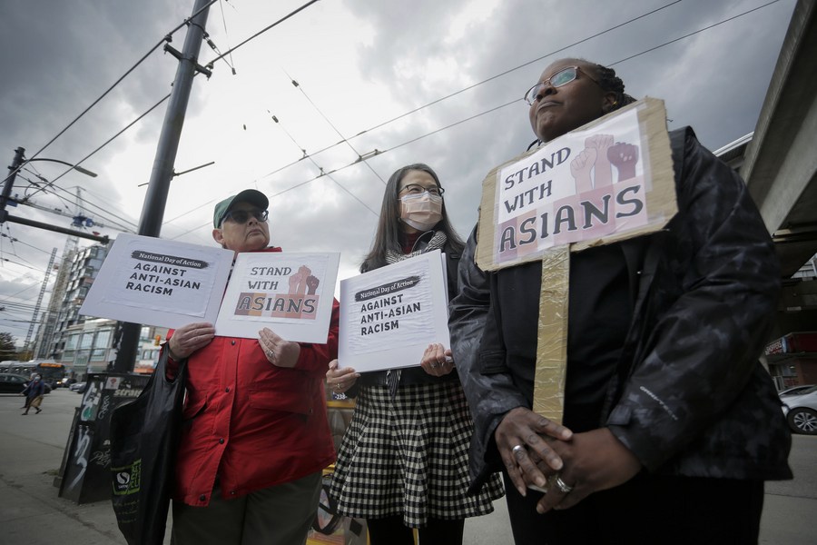 People hold signs during a rally against anti-Asian racism in Vancouver, British Columbia, Canada, on May 10, 2022. (Photo by Liang Sen/Xinhua)■