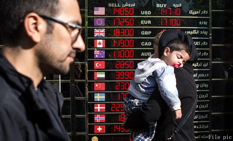 People walk past a board showing the rates of currencies at a currency exchange center in central Tehran, Iran, on Nov. 1, 2018. The U.S. sanctions to target Iran's most crucial part of the economy, namely its oil exports, will start on Nov. 4. (Xinhua/Ahmad Halabisaz)
