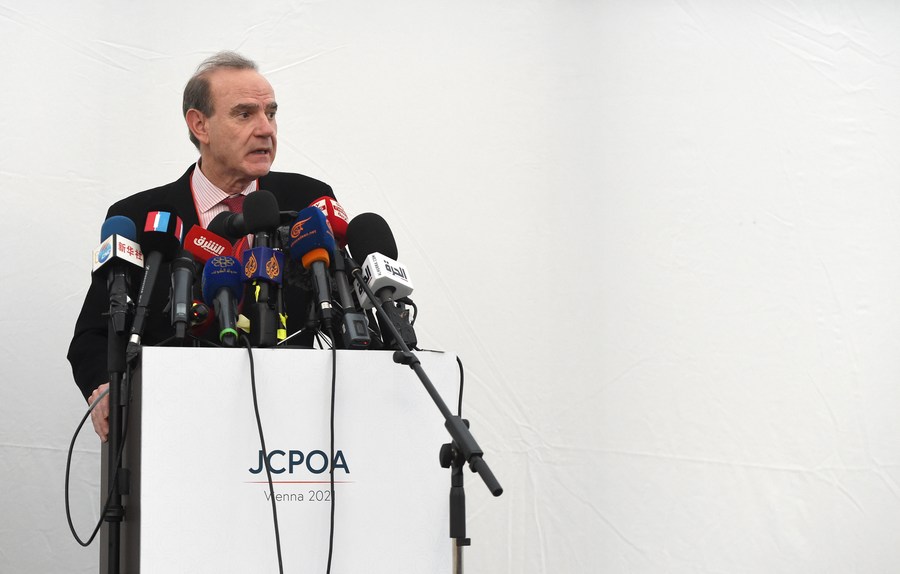 Enrique Mora, deputy secretary-general of the European External Action Service, speaks to reporters after a meeting of the Joint Comprehensive Plan of Action (JCPOA) Joint Commission in Vienna, Austria, on Dec. 9, 2021. (Xinhua/Guo Chen)