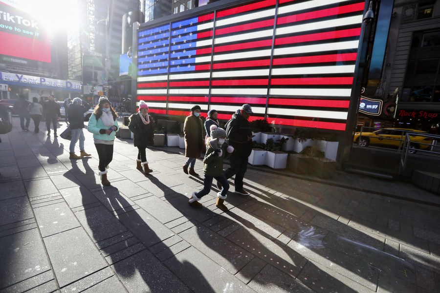 People walk on Times Square in New York, the United States, Nov. 23, 2021. (Xinhua/Wang Ying)