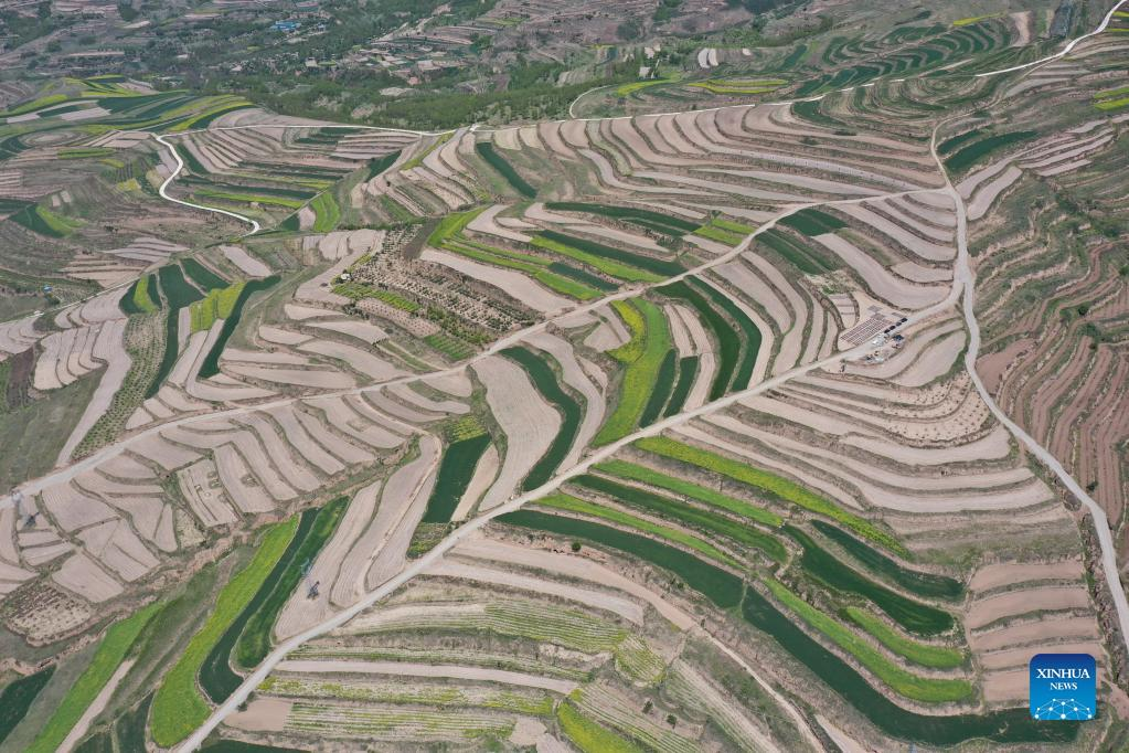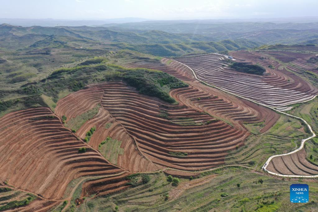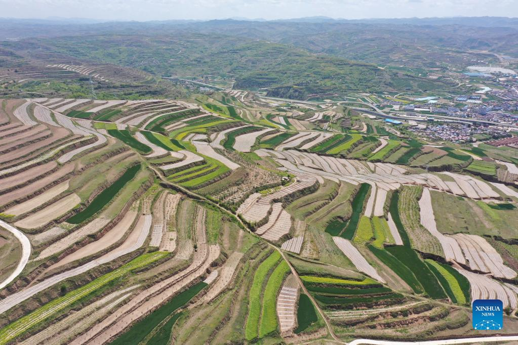 Aerial photo taken on May 11, 2022 shows a view of reclaimed farmland in Qinzhou District of Tianshui, northwest China's Gansu Province. In recent years, Qinzhou of Tianshui has been encouraging enterprises, cooperatives and family farms to reclaim abandoned farmland. So far, over 73,000 mu (about 4,867 hectares) abandoned farmland has been reclaimed in Qinzhou. (Xinhua/Du Zheyu)