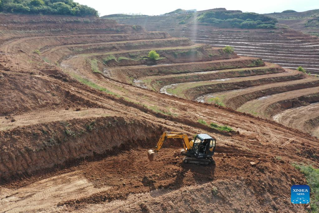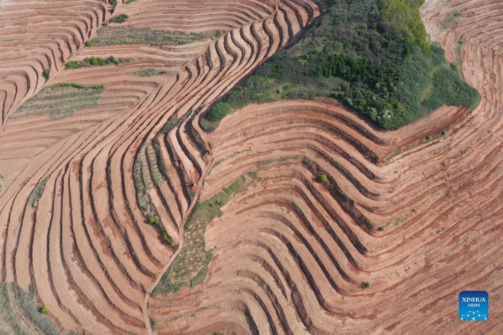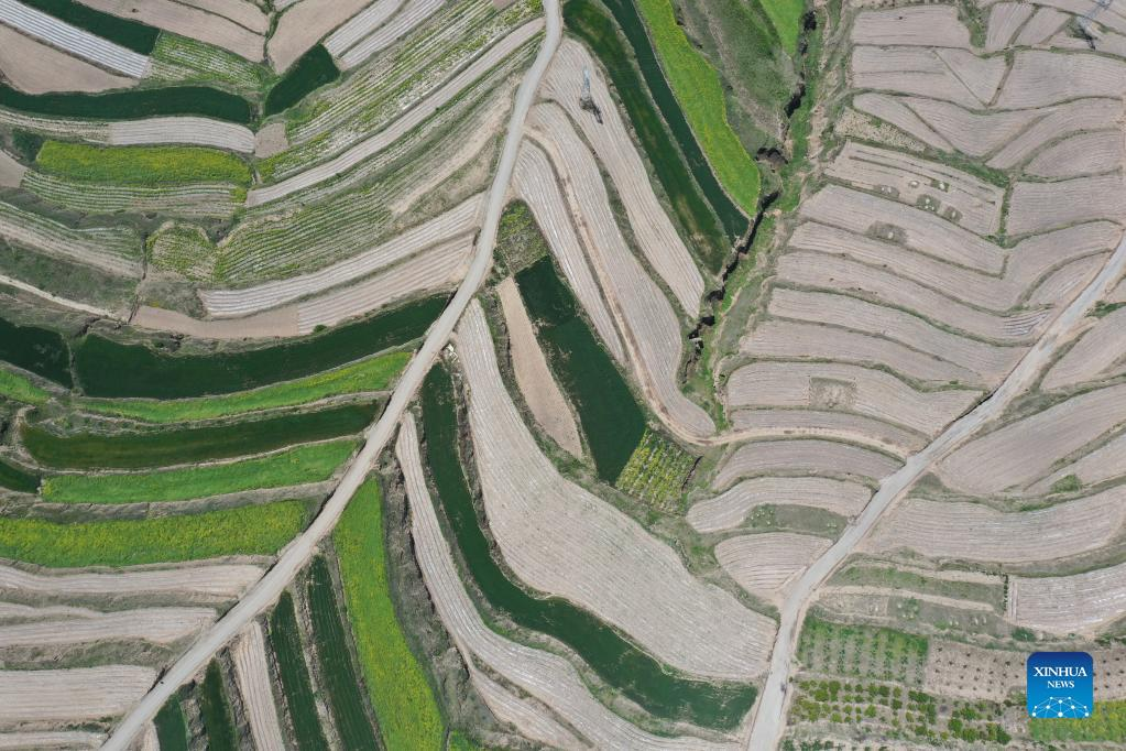 Aerial photo taken on May 11, 2022 shows a view of reclaimed farmland in Qinzhou District of Tianshui, northwest China's Gansu Province. In recent years, Qinzhou of Tianshui has been encouraging enterprises, cooperatives and family farms to reclaim abandoned farmland. So far, over 73,000 mu (about 4,867 hectares) abandoned farmland has been reclaimed in Qinzhou. (Xinhua/Wen Jing)