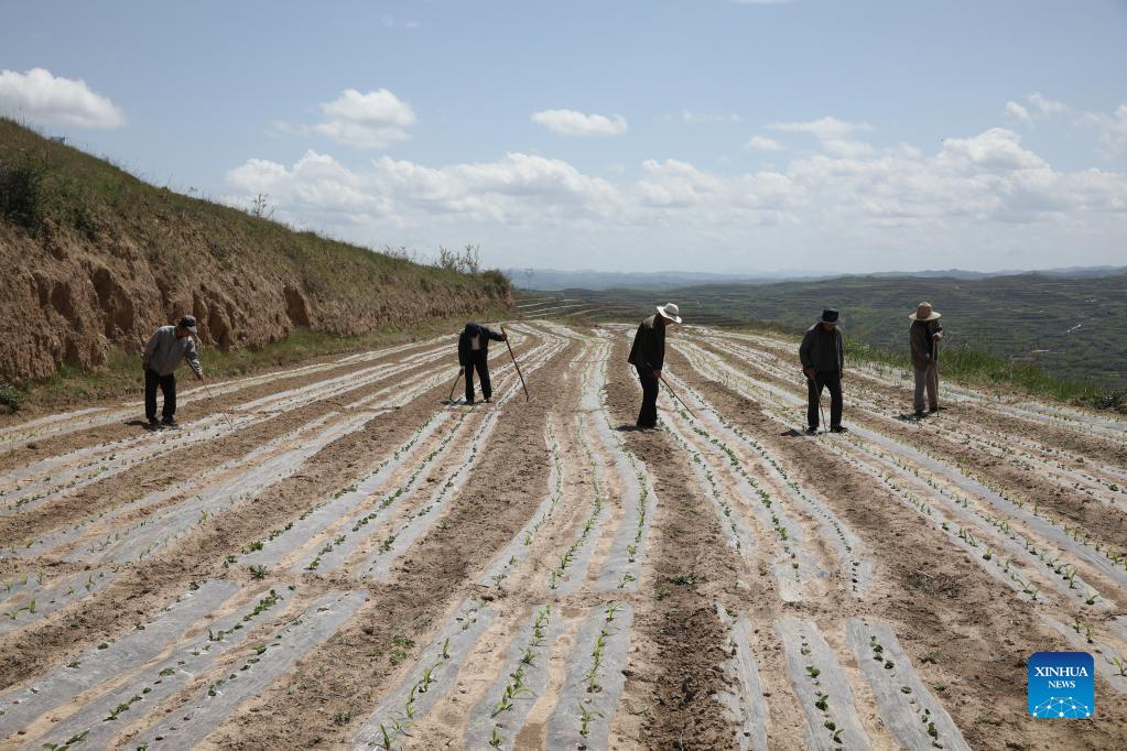 Farmers work in fields of reclaimed farmland in Qinzhou District of Tianshui, northwest China's Gansu Province, May 11, 2022. In recent years, Qinzhou of Tianshui has been encouraging enterprises, cooperatives and family farms to reclaim abandoned farmland. So far, over 73,000 mu (about 4,867 hectares) abandoned farmland has been reclaimed in Qinzhou. (Xinhua/Wang Zixuan)