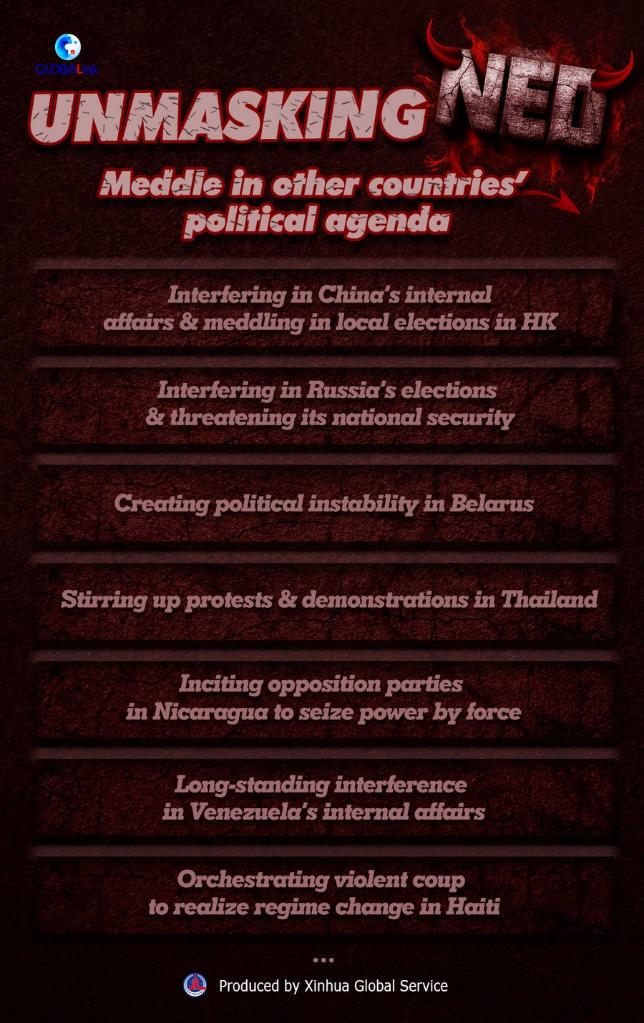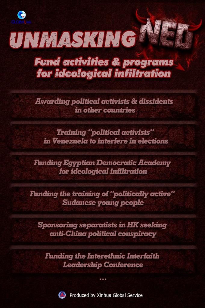 The National Endowment for Democracy (NED), which takes orders directly from the U.S. government and manipulates NGOs through the provision of funding to conduct subversion, infiltration and sabotage to serve U.S. strategic interests, is actually the "second CIA" of the United States, a Chinese Foreign Ministry spokesperson said recently.