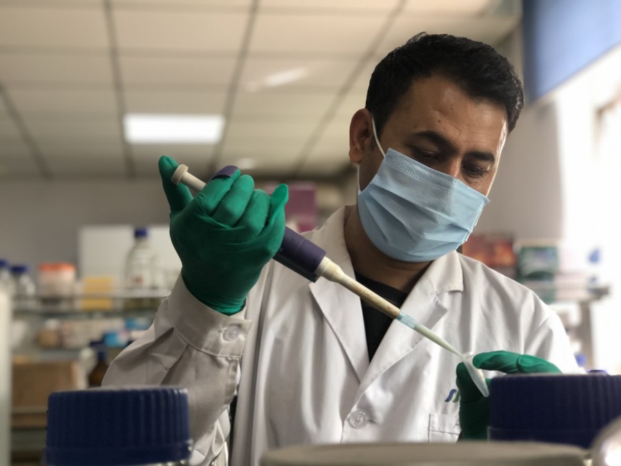 Aman Khan works in a lab in Lanzhou, northwest China's Gansu Province, May 6, 2022. (Xinhua/Zhang Wenjing)
