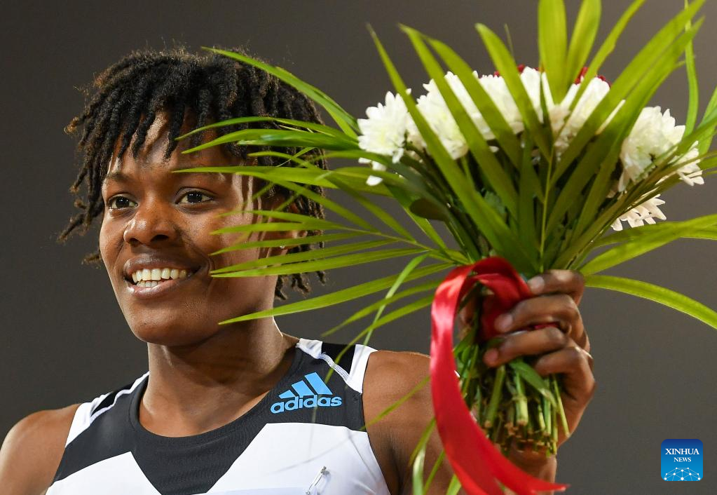 Marileidy Paulino of Dominican Republic celebrates after winning the women's 400m race at the 2022 Diamond League athletics meeting at Suhaim bin Hamad Stadium in Doha, capital of Qatar, May 13, 2022. (Photo by Nikku/Xinhua)