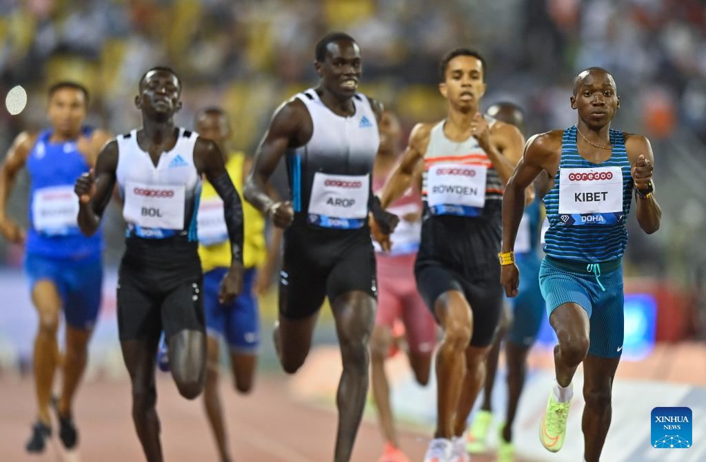 Noah Kibet (1st R) of Kenya competes during the men's 800m race at the 2022 Diamond League athletics meeting at Suhaim bin Hamad Stadium in Doha, capital of Qatar, May 13, 2022. (Photo by Nikku/Xinhua)