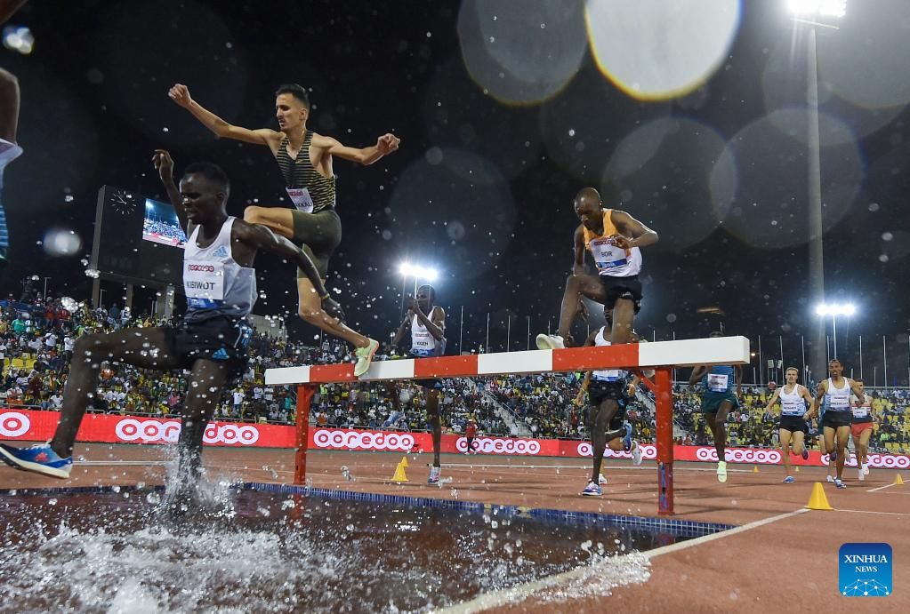 Soufiane El-Bakkali (top) of Morocco competes during the men's Steeplechase 3000m event at the 2022 Diamond League athletics meeting at Suhaim bin Hamad Stadium in Doha, capital of Qatar, May 13, 2022. (Photo by Nikku/Xinhua)