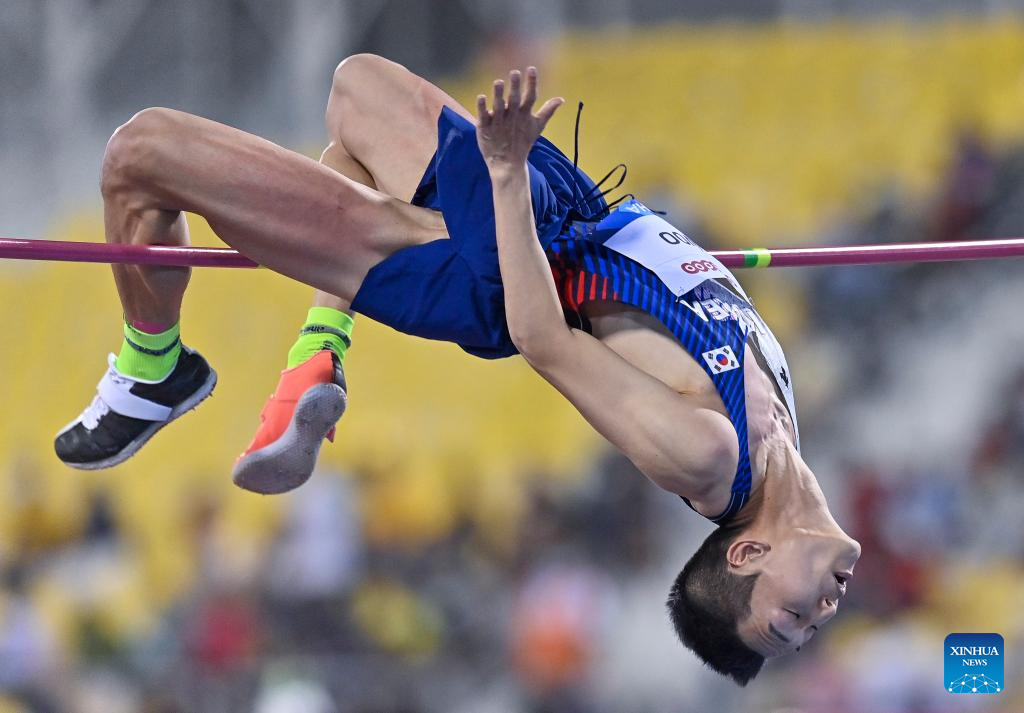 Woo Sang-hyeok of South Korea competes during the men's high jump at the 2022 Diamond League athletics meeting at Suhaim bin Hamad Stadium in Doha, capital of Qatar, May 13, 2022. (Photo by Nikku/Xinhua)