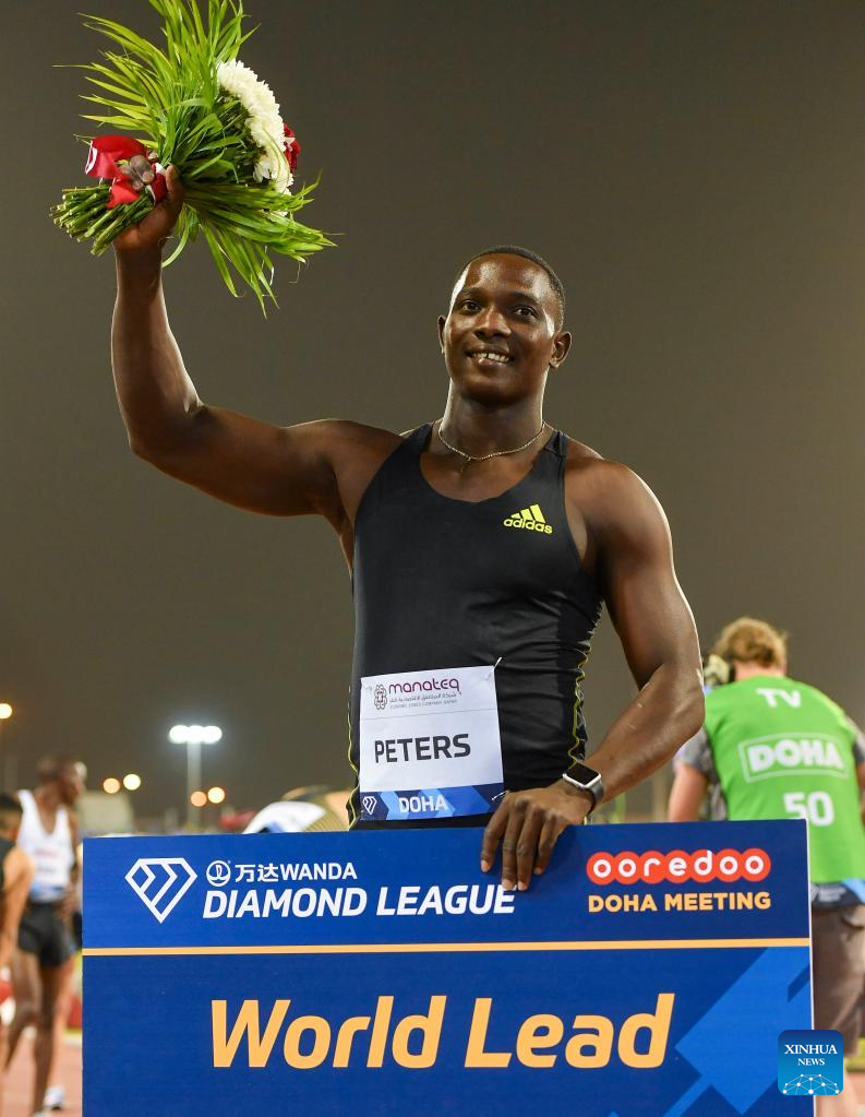 Anderson Peters of Grenada celebrates after winning the men's javelin throw at the 2022 Diamond League athletics meeting at Suhaim bin Hamad Stadium in Doha, capital of Qatar, May 13, 2022. (Photo by Nikku/Xinhua)