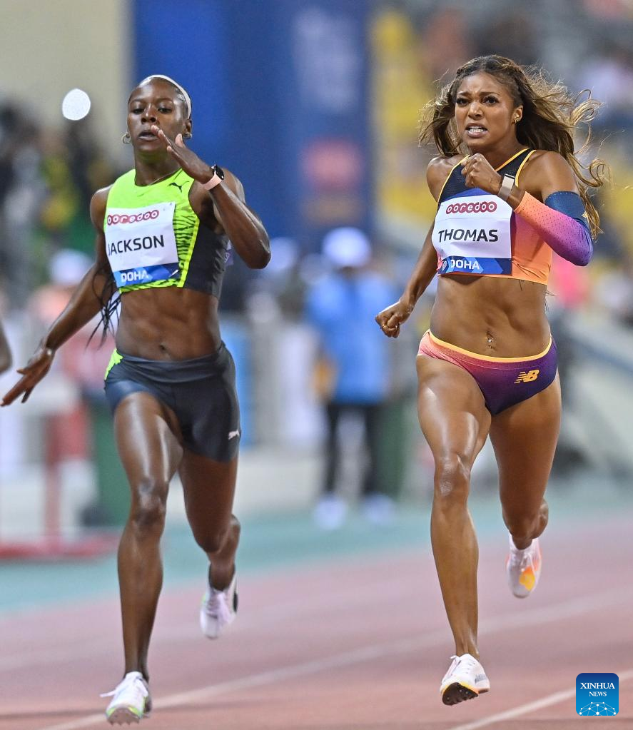 Gabrielle Thomas (R) of the United States competes during the women's 200m race at the 2022 Diamond League athletics meeting at Suhaim bin Hamad Stadium in Doha, capital of Qatar, May 13, 2022. (Photo by Nikku/Xinhua)