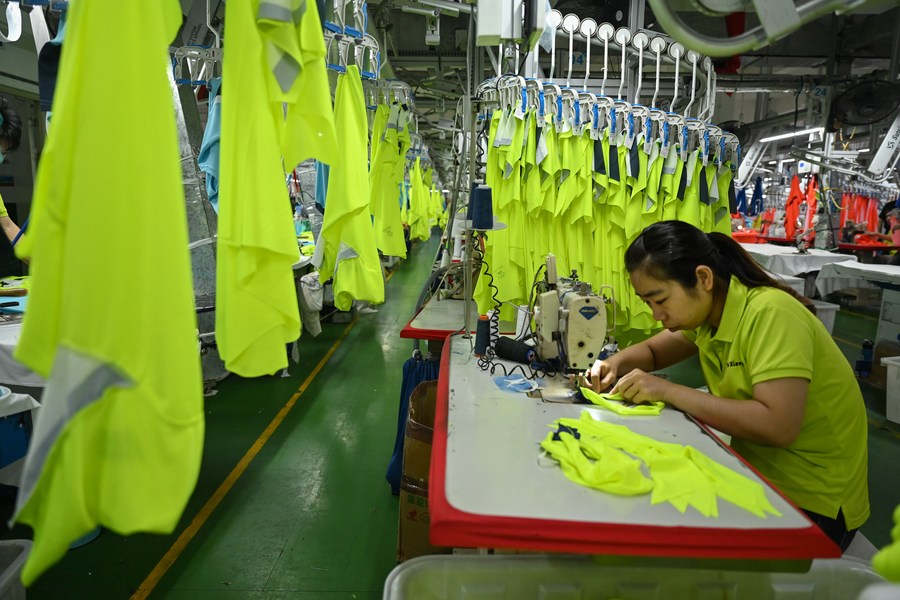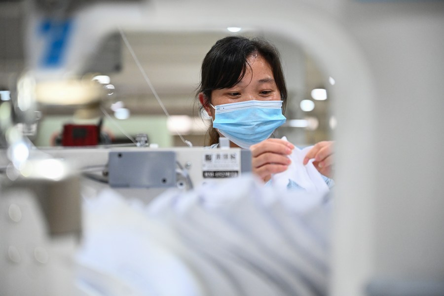 A staff member works on a production line in the manufacturer of the Spanish sports brand Kelme in Jinjiang City, southeast China's Fujian Province, May 13, 2022. (Photo by Zhou Yi/Xinhua)