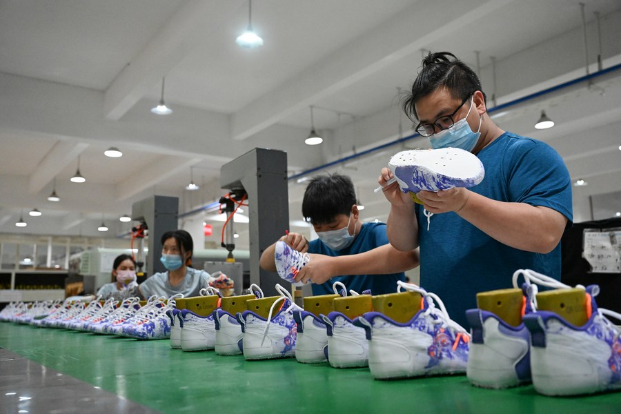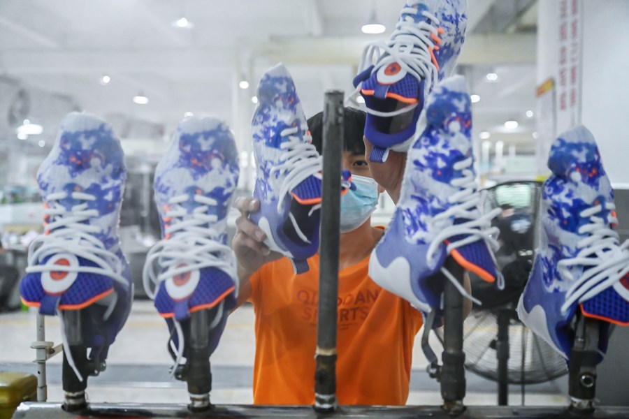 A staff member works on a production line in a sports shoe company in Jinjiang City, southeast China's Fujian Province, May 14, 2022. (Photo by Zhou Yi/Xinhua)