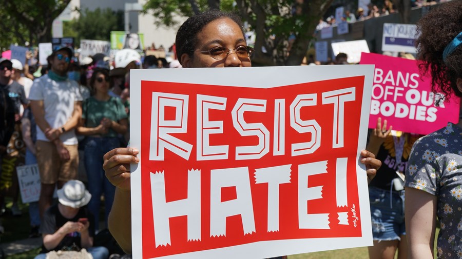 Demonstrators attend a rally in downtown Los Angeles, California, the United States, on May 14, 2022. (Photo by Zeng Hui/Xinhua)