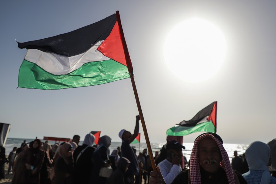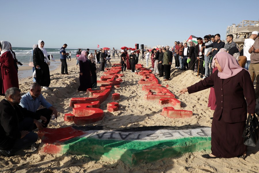 Palestinian people attend a rally ahead of the 74th anniversary of the Nakba Day at a beach in Gaza City, on May 8, 2022. (Photo by Rizek Abdeljawad/Xinhua)