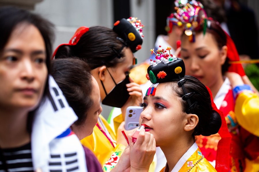 Participants prepare for the first-ever annual Asian American and Pacific Islander (AAPI) Cultural and Heritage Parade in New York, the United States, May 15, 2022. (Photo by Michael Nagle/Xinhua)