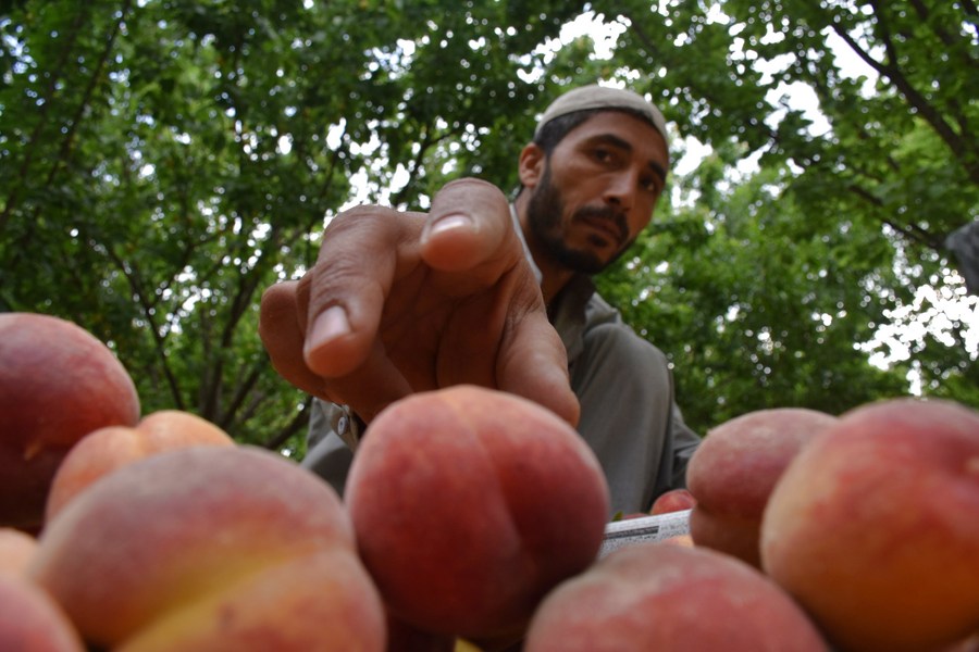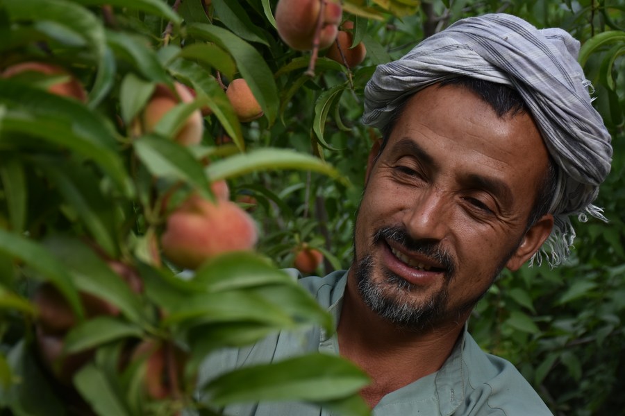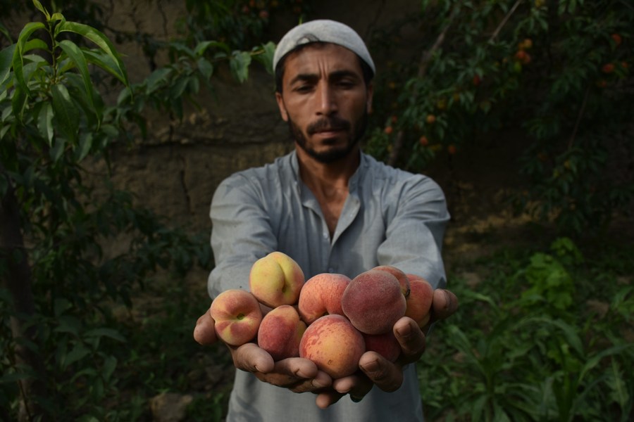 A farmer shows newly-harvested peaches in an orchard in Balkh Province, Afghanistan, May 14, 2022. (Photo by Kawa Basharat/Xinhua)