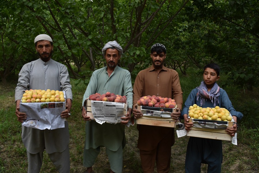 Farmers show fruit picked in an orchard in Balkh Province, Afghanistan, May 14, 2022. (Photo by Kawa Basharat/Xinhua)