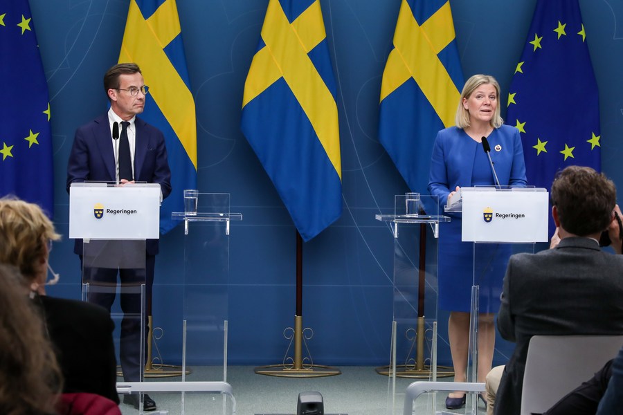 Swedish Prime Minister Magdalena Andersson (R) holds a press conference together with the Moderate Party's leader Ulf Kristersson in Stockholm, Sweden, on May 16, 2022. (Ninni Andersson/Government Offices of Sweden/Handout via Xinhua)
