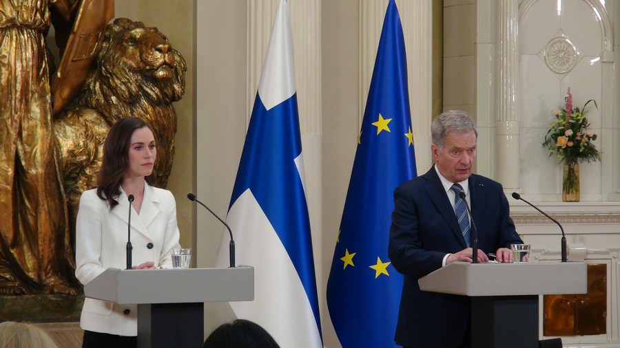 Finland's President Sauli Niinisto (R) and Prime Minister Sanna Marin attend a joint press conference in Helsinki, Finland, May 15, 2022. (Xinhua/Chen Jing)