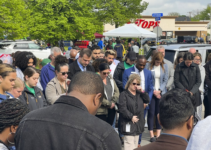 People attend a gathering to mourn for the victims of a mass shooting in Buffalo of New York State, the United States, May 16, 2022. (Photo by Zhang Jie/Xinhua)