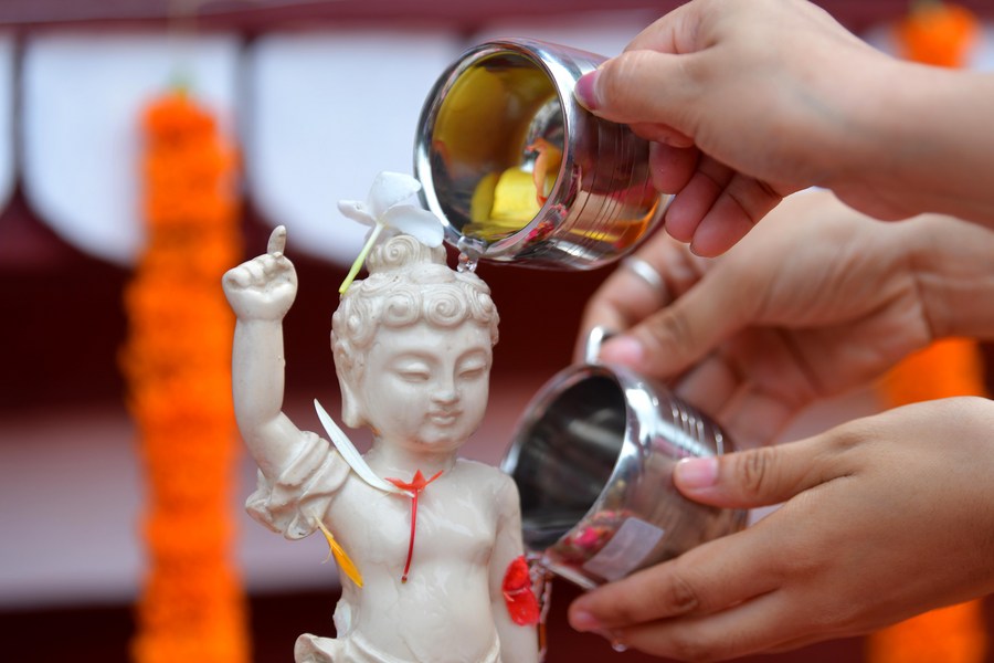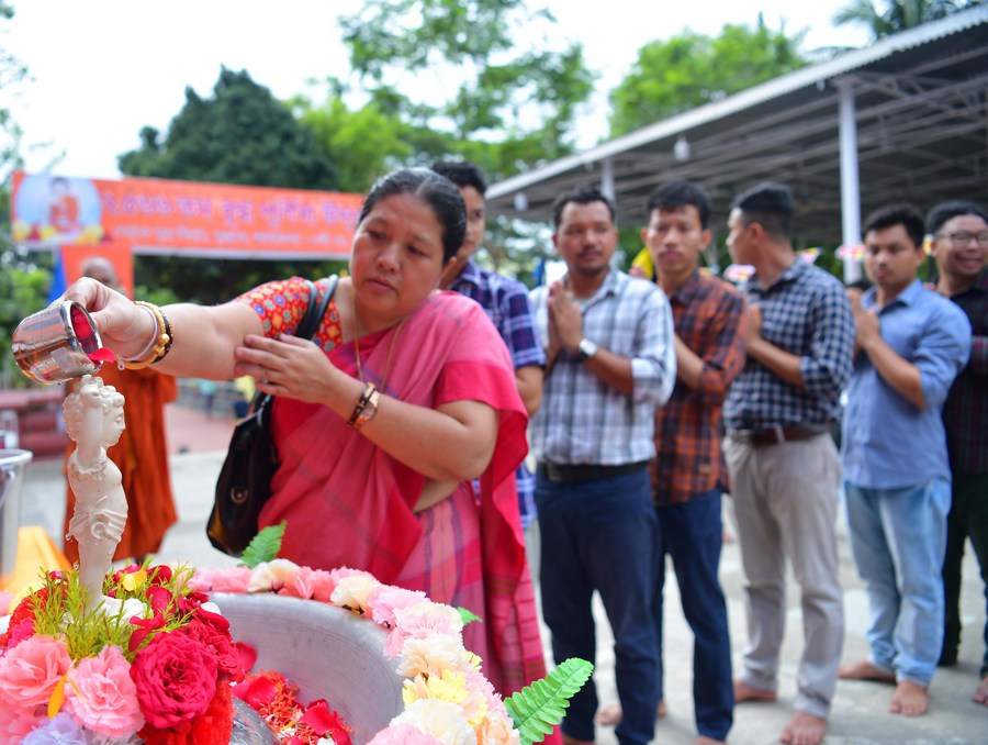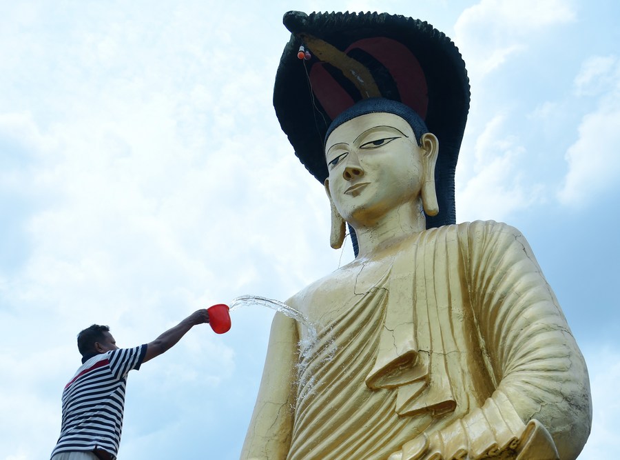 Devotees pour water over a Buddha statue during Vesak Day celebrations at Benuban Vihar monastery in Agartala, the capital city of India's northeastern state of Tripura, May 16, 2022. (Str/Xinhua)