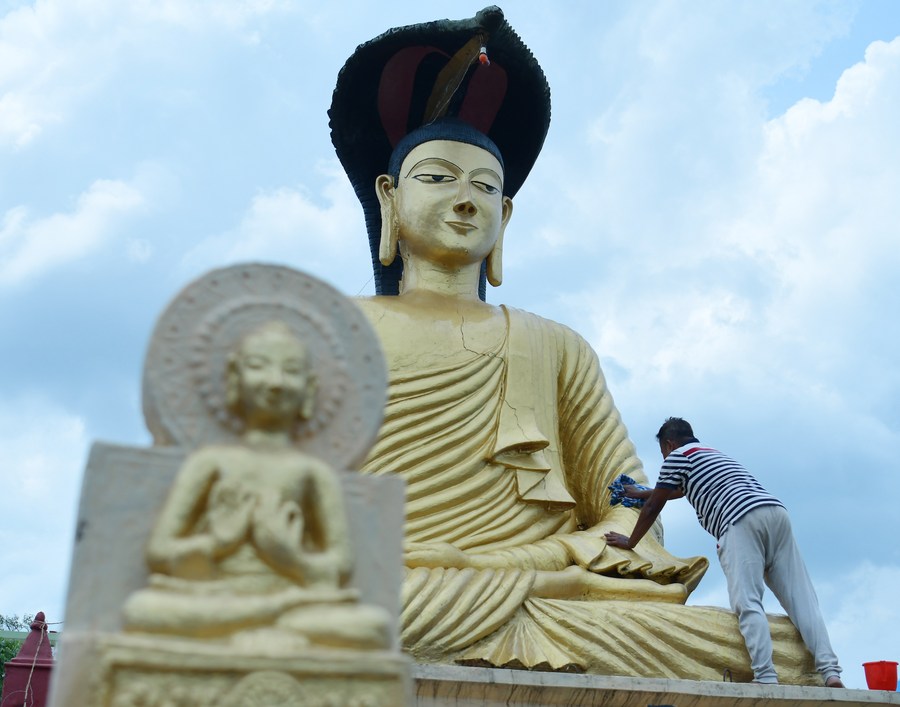 A devotee cleans a statue of Lord Buddha at a monastery ahead of Vesak Day in Agartala, Tripura, India, May 15, 2022. (Str/Xinhua)