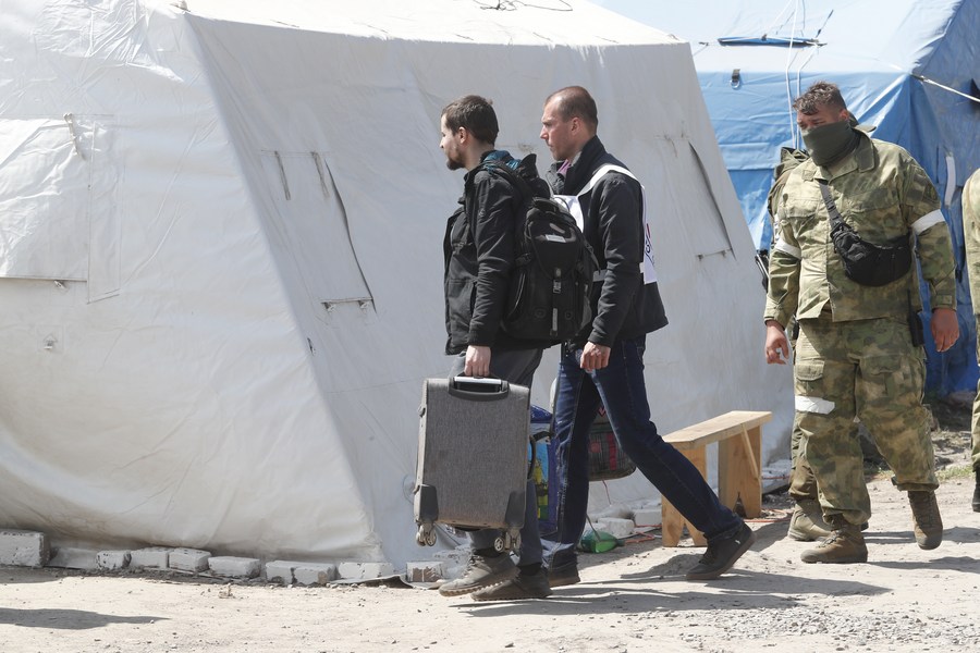 People evacuated from the Azovstal plant and adjacent houses in Mariupol arrive at a temporary accommodation center in the village of Bezimenne in Donetsk, May 1, 2022. (Photo by Victor/Xinhua)