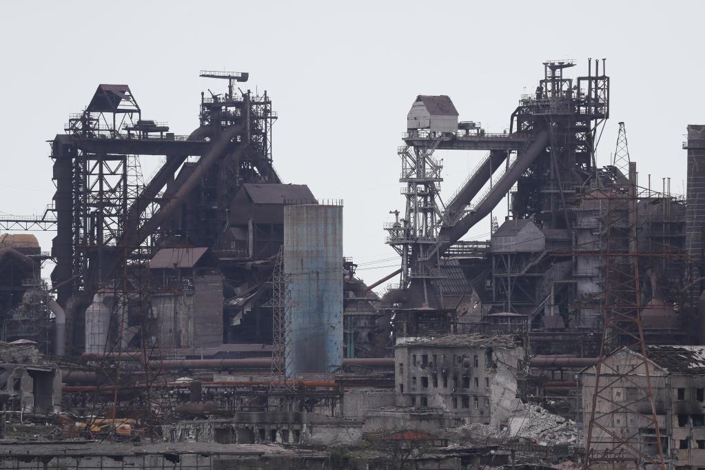 Photo taken on May 15, 2022 shows a view of the Azovstal plant in the port city of Mariupol. (Photo by Victor/Xinhua)