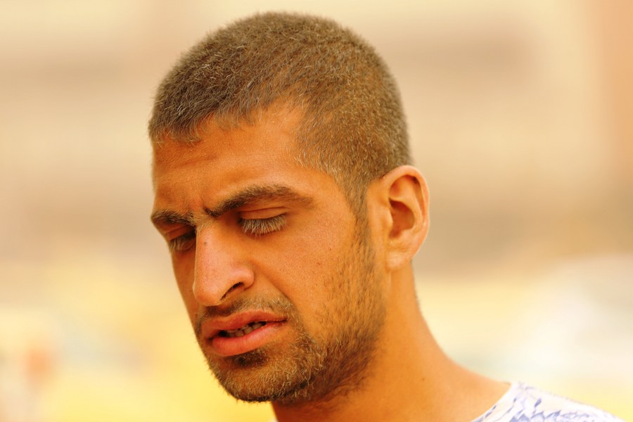 A man is seen during dust storm in Baghdad, Iraq, on May 16, 2022. A dust storm swept across much of Iraq on Monday, sending more than 2,000 people to hospitals with respiratory problems and forcing the closure of airports, schools and some government offices. (Xinhua/Khalil Dawood)
