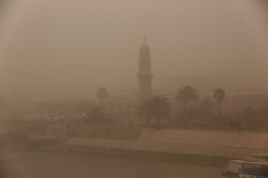 A dust storm hits Baghdad, Iraq, on May 16, 2022. A dust storm swept across much of Iraq on Monday, sending more than 2,000 people to hospitals with respiratory problems and forcing the closure of airports, schools and some government offices. (Xinhua/Khalil Dawood)