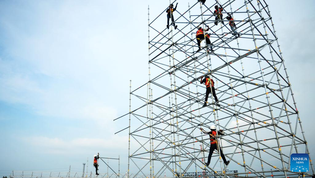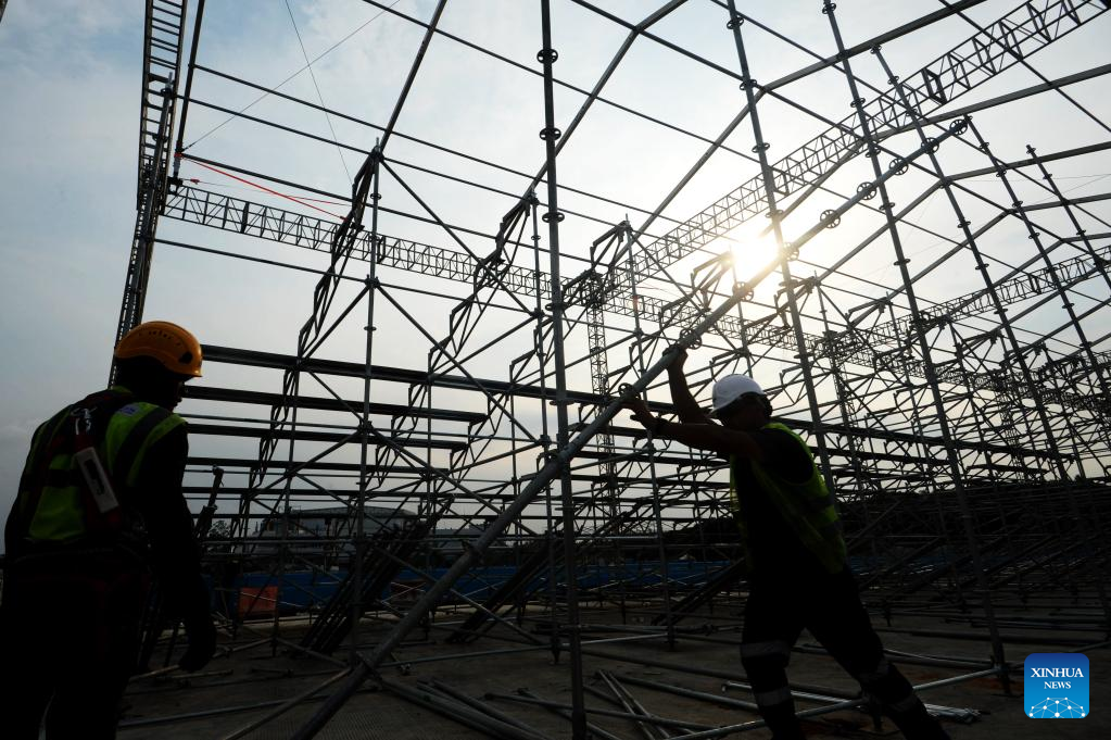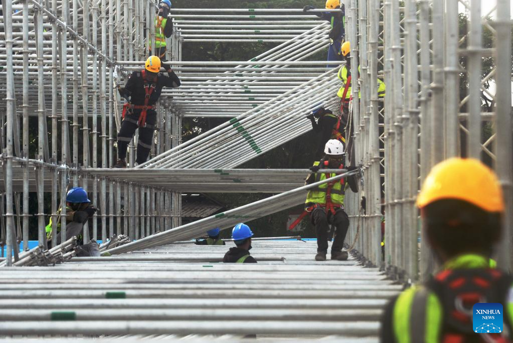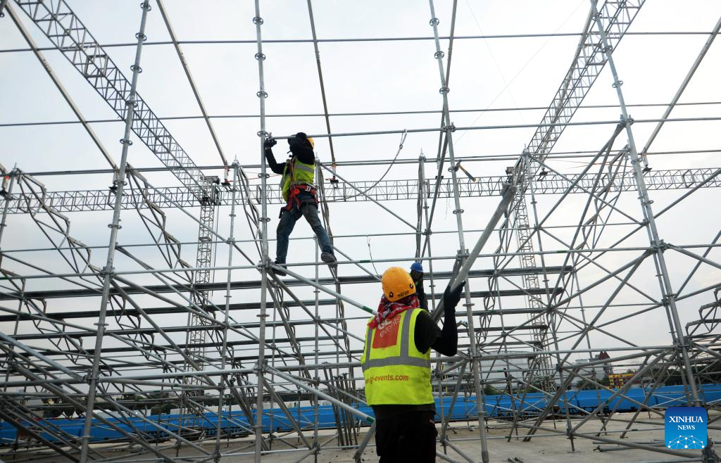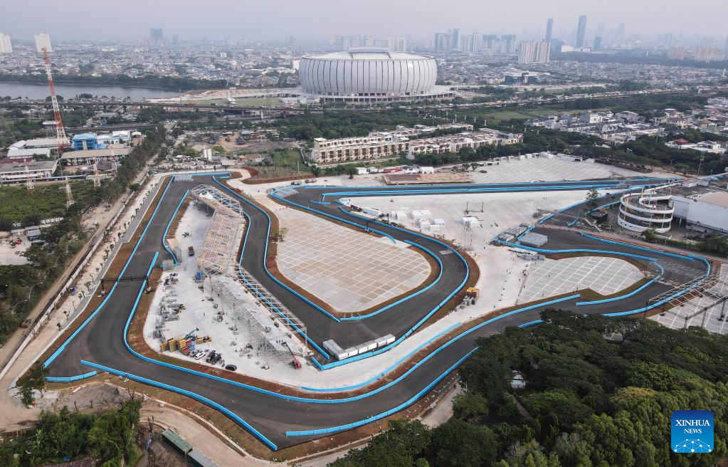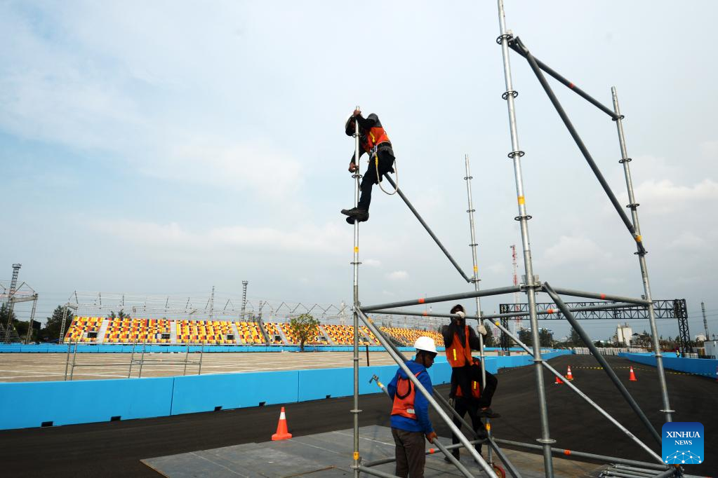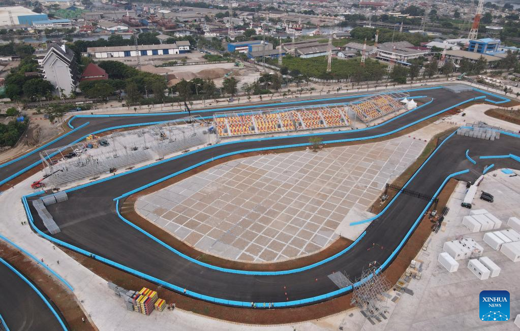 Workers work for construction at the Jakarta International E-Prix Circuit (JIEC) in Jakarta, Indonesia, May 17, 2022. Jakarta E-Prix will be held on June 4, 2022. (Xinhua/Agung Kuncahya B.)