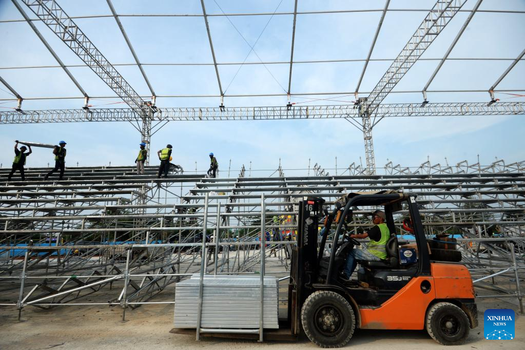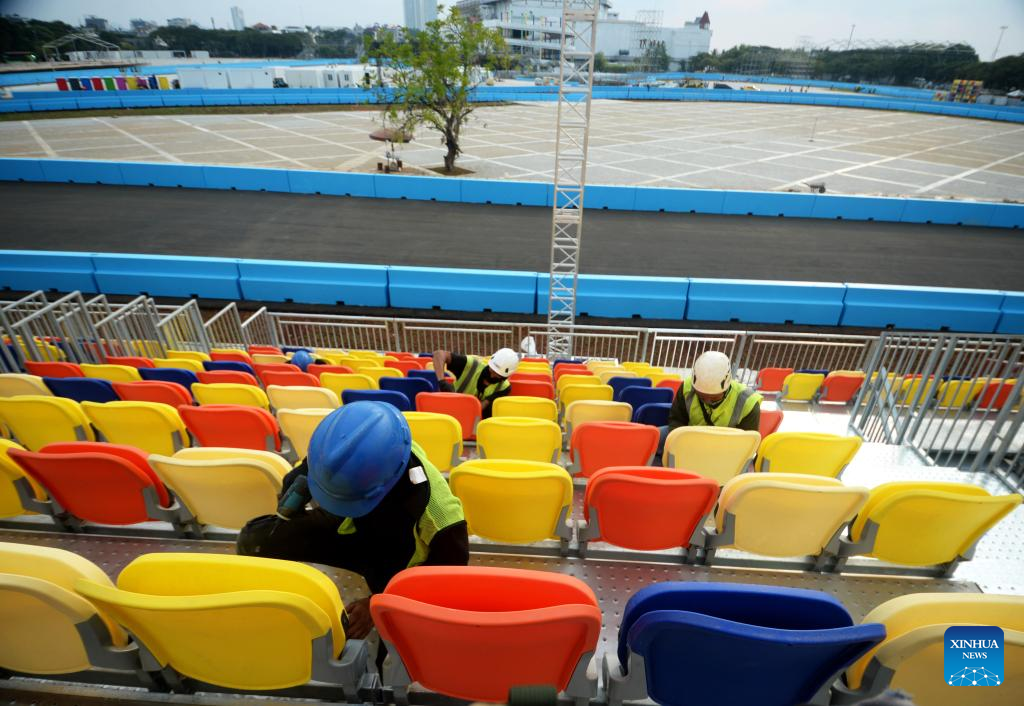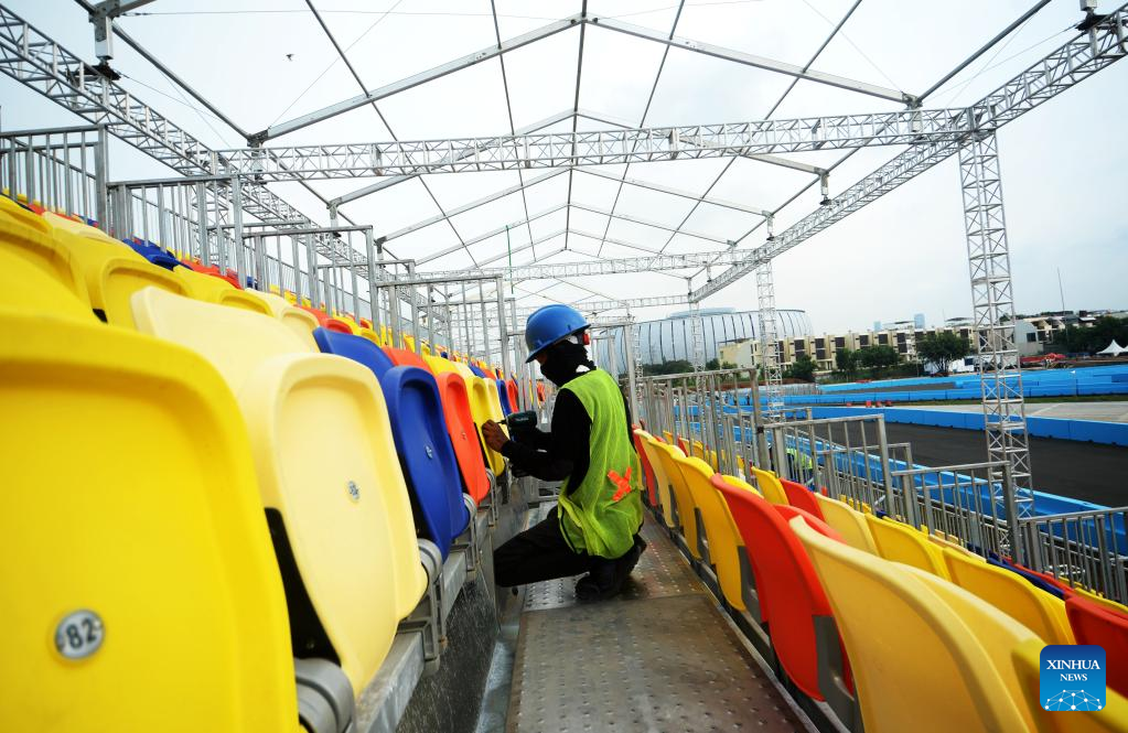 Workers set up chairs at the Jakarta International E-Prix Circuit (JIEC) in Jakarta, Indonesia, May 17, 2022. Jakarta E-Prix will be held on June 4, 2022. (Xinhua/Agung Kuncahya B.)