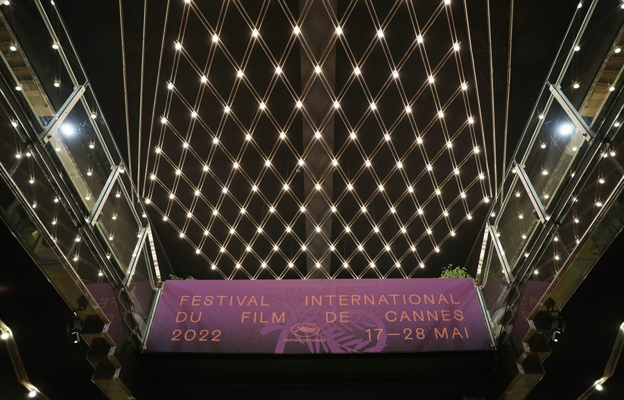 An official poster is seen outside the Palais des Festivals ahead of the 75th Cannes Film Festival in Cannes, southern France, May 16, 2022. (Xinhua/Gao Jing)