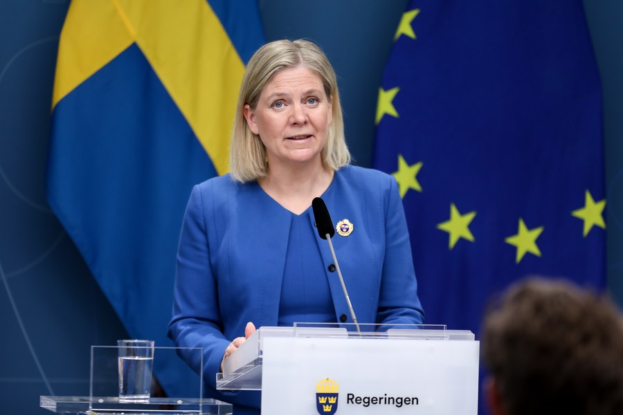 Swedish Prime Minister Magdalena Andersson speaks at a press conference in Stockholm, Sweden, May 16, 2022. (Ninni Andersson/Government Offices of Sweden/Handout via Xinhua)