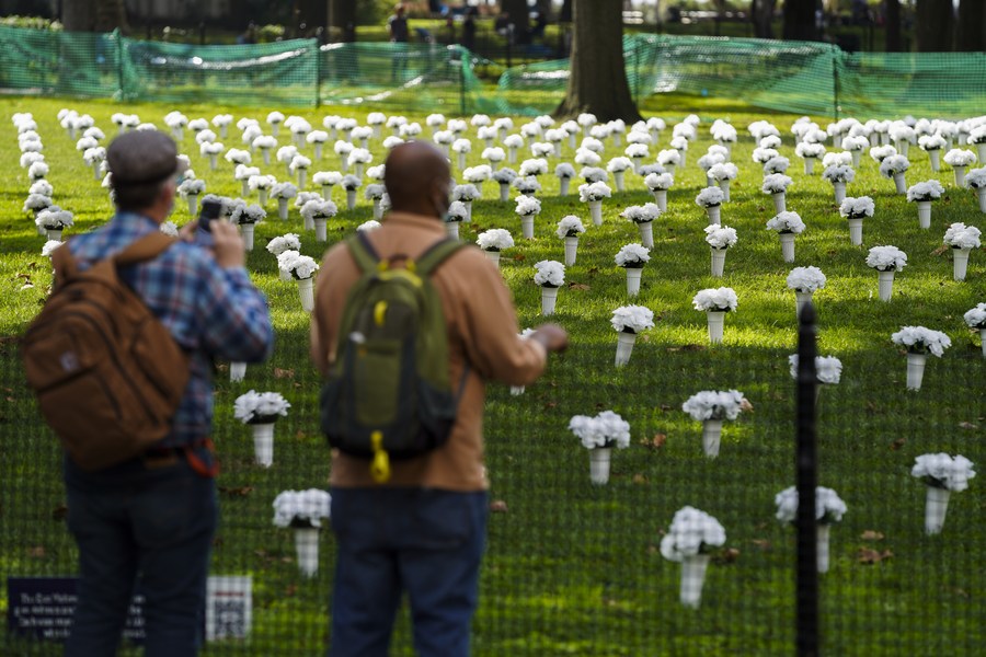 People look at the vases of flowers installed to memorize gun violence victims at the Battery Park in New York, the United States, on Oct. 8, 2021. (Xinhua/Wang Ying)