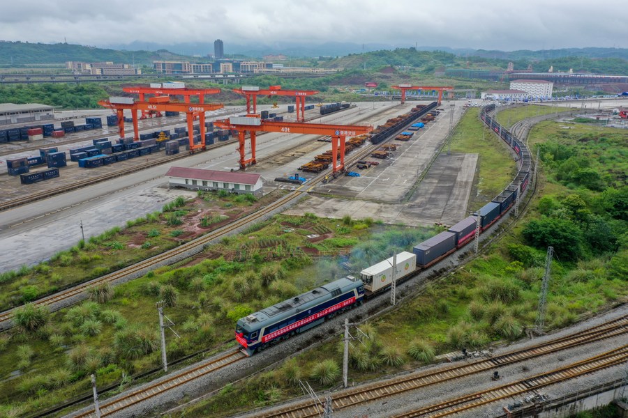 Aerial photo shows the first cargo train of the Chengdu-Chongqing economic circle departed from a station in Jiangjin District, southwest China's Chongqing Municipality, for Chengdu, capital of Sichuan Province, May 19, 2022. (Xinhua/Tang Yi)