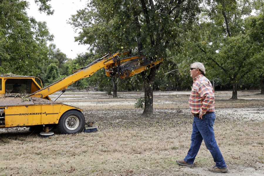 File photo taken on Oct. 24, 2019 shows Randy Hudson, chief executive officer of Hudson Pecan Company and former president of U.S. Pecan Growers Council, walking in the field as pecans are shaken off the tree in one of his orchards near Ocilla, Georgia, the United States. (Xinhua/Li Muzi)